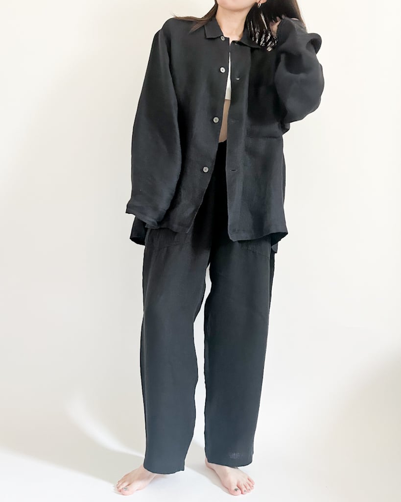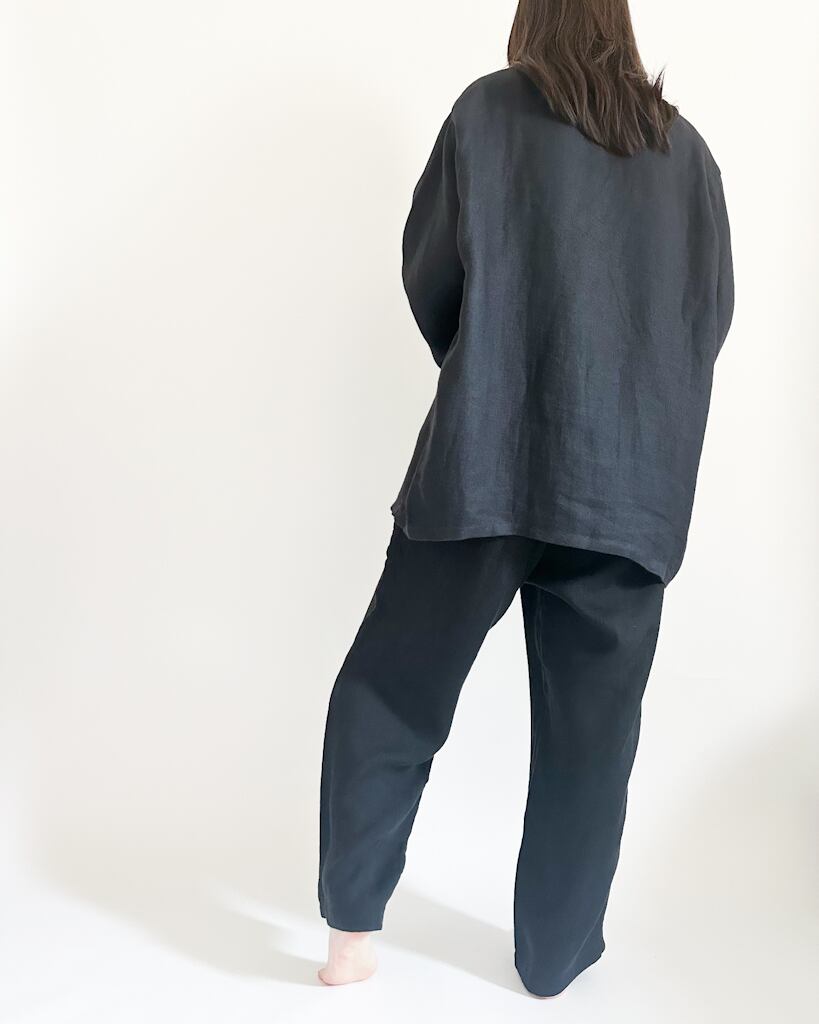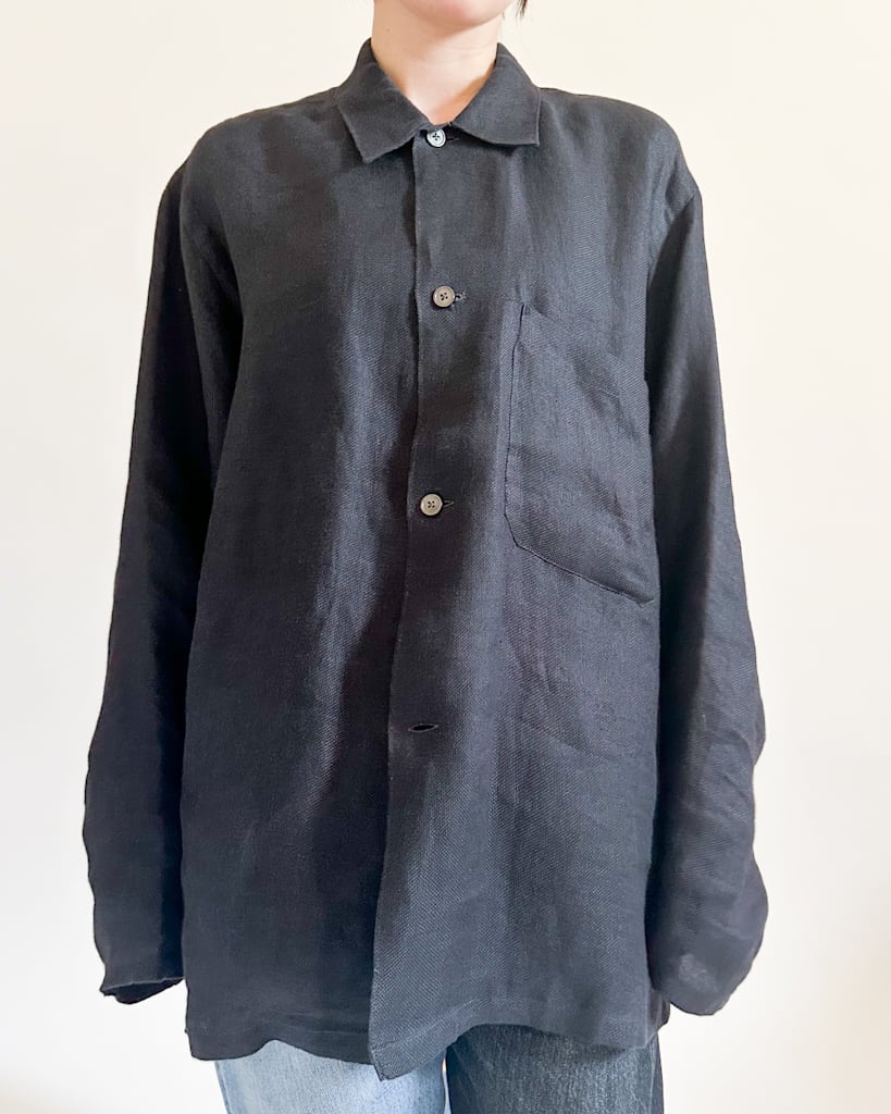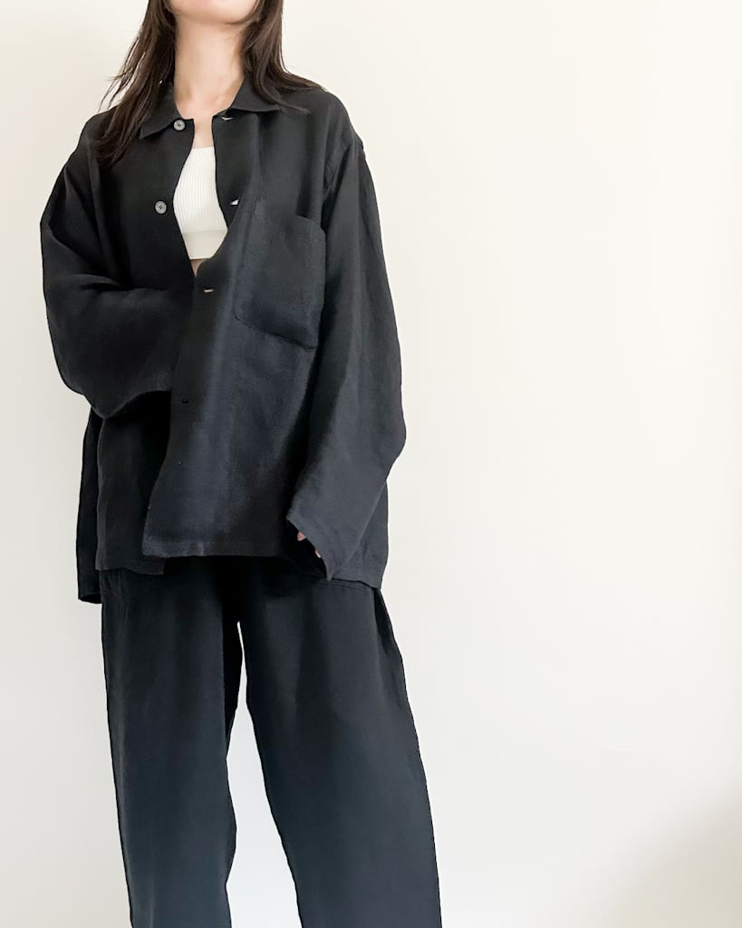 ほどよくゆったりとしたシルエットにリネン特有の硬さの中にほどよい柔らかさと光沢感。