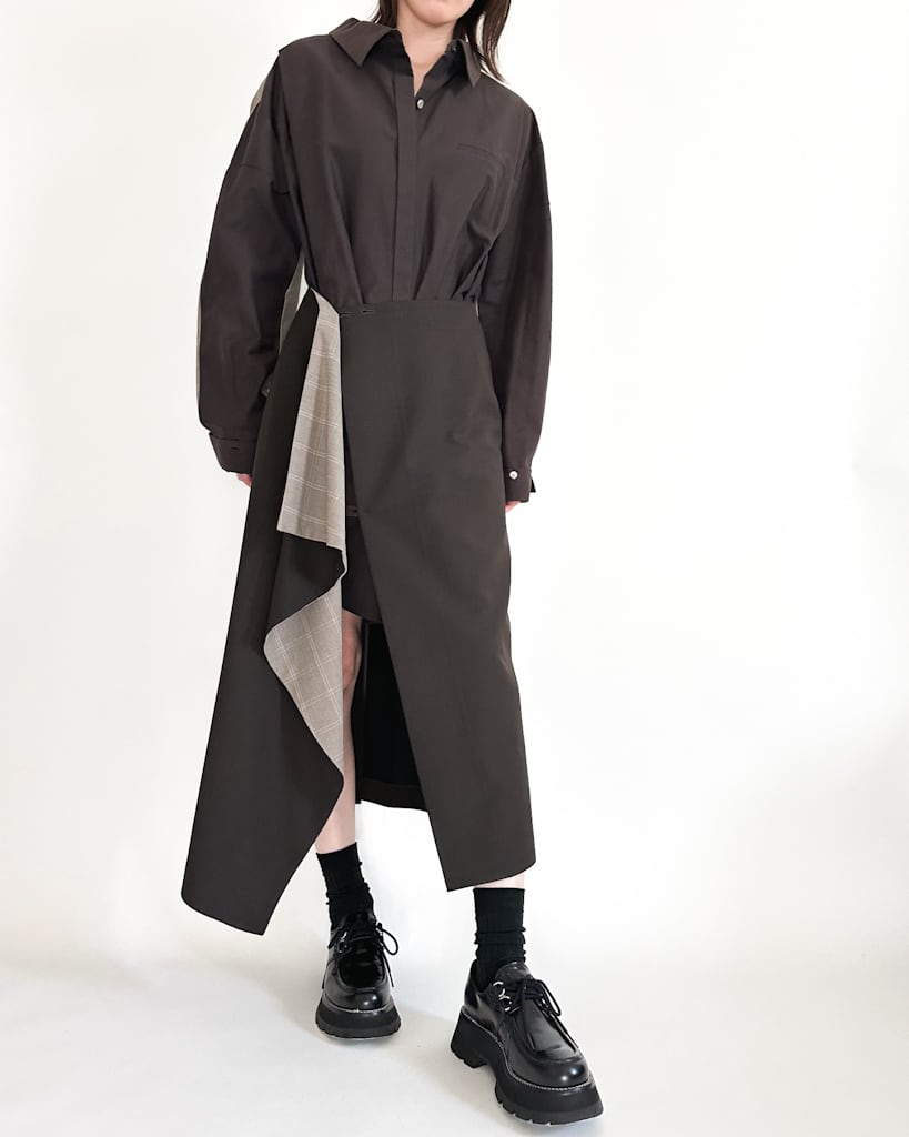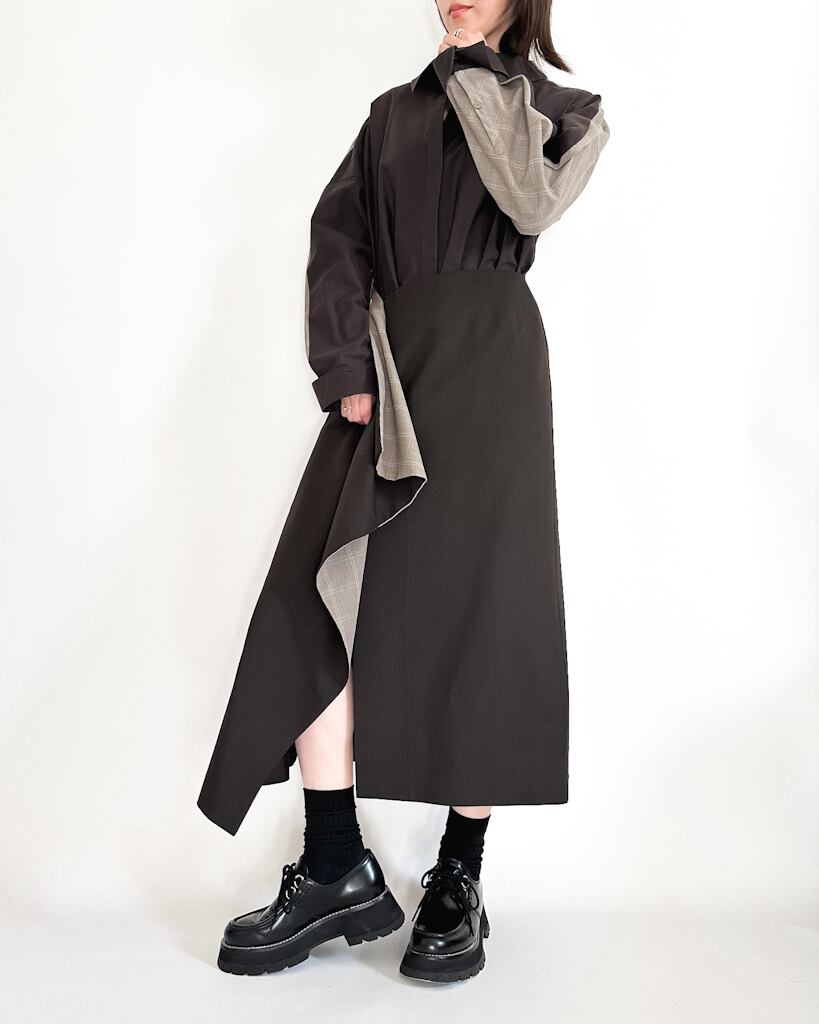 動くたびに揺れるデザインが存在感を放つ変形ワンピース。