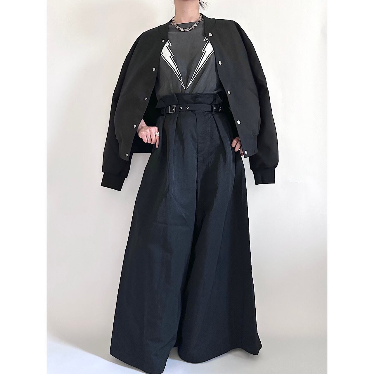 ラフにTシャツと、ブラックコーデで思いきりモードに、凛としたアイテムと合わせてお呼ばれコーデなど、合わせるものによって表情豊かに変わる楽しい1着です。