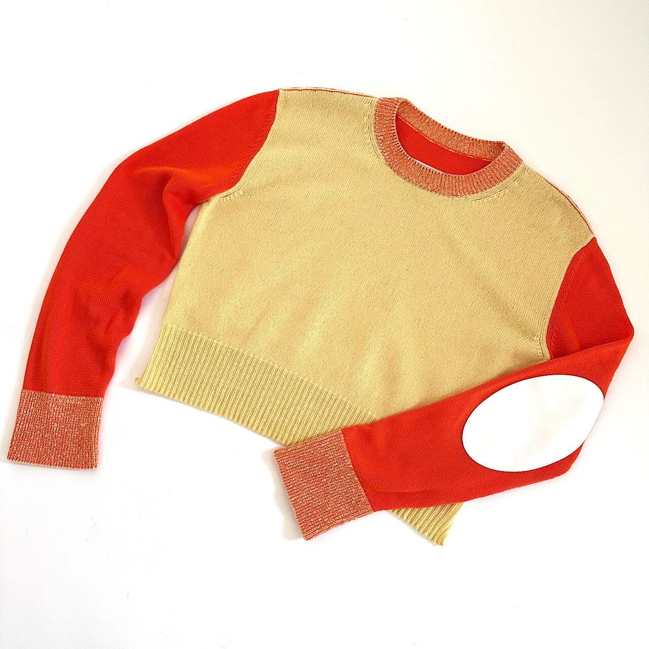 鮮やかなオレンジと潔いホワイトの肘あてがチャームポイント。短め丈の設定でバランスの取りやすい1着です。