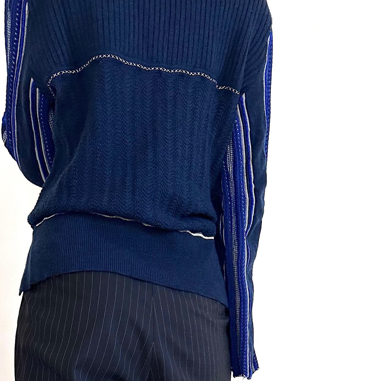 何種もの織りが表情豊かに、シルエットは飽きのこないシンプルなデザインニット。